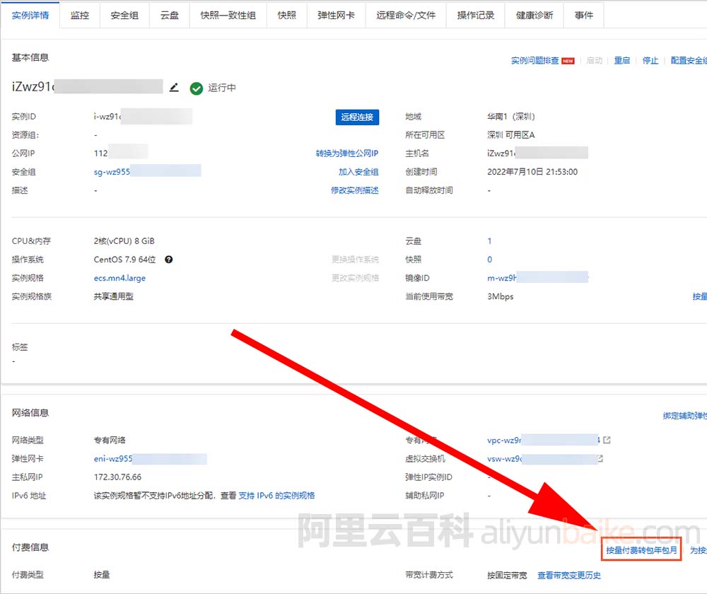 如果你的云服务器1个月免费试用期到后,想要继续使用,可以将该台云服务器从按量付费转包年包月计费模式,如下图: